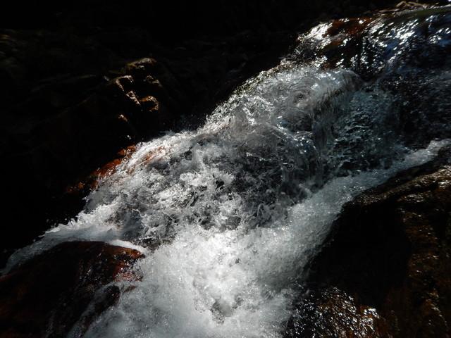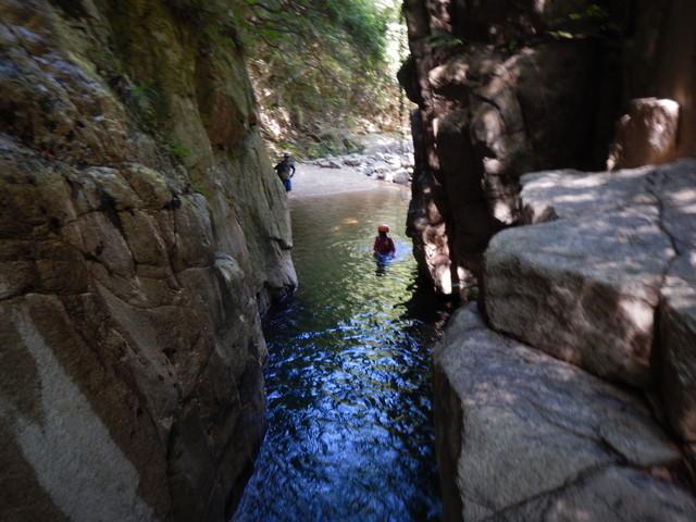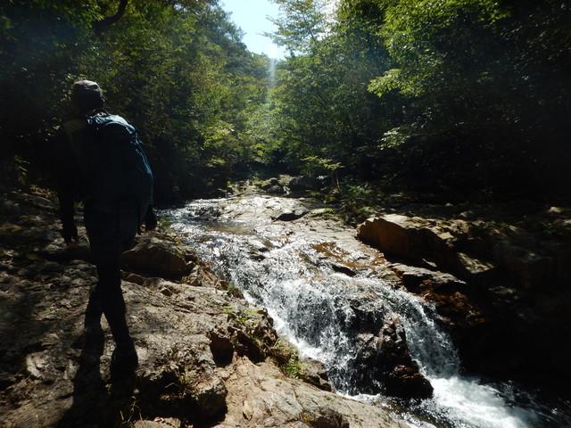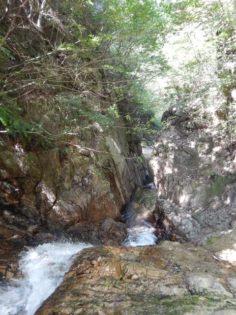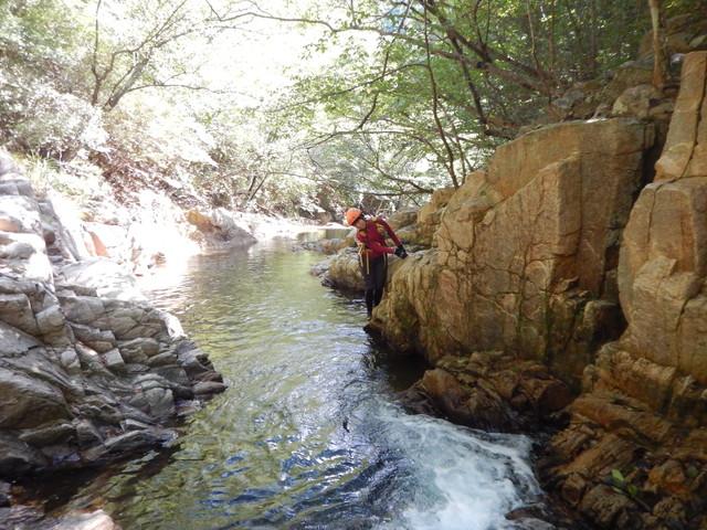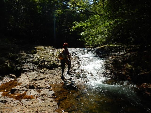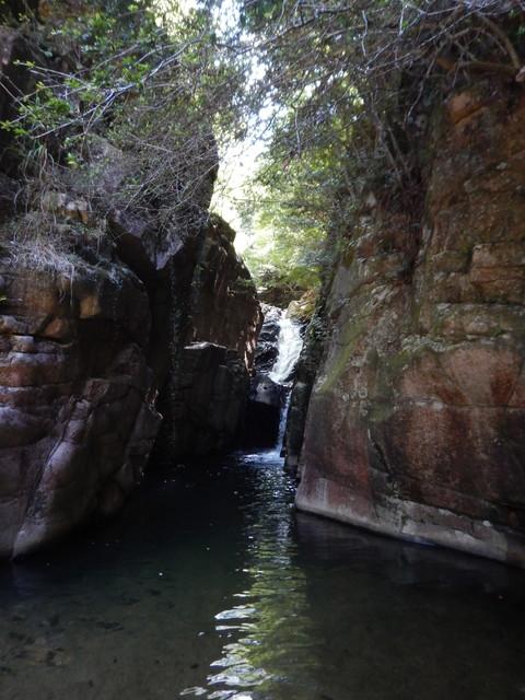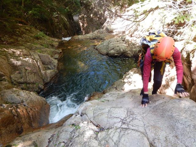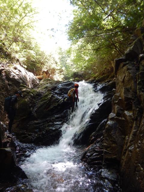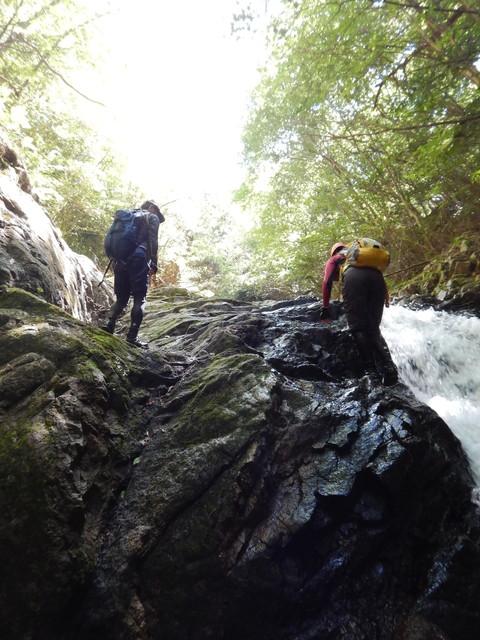 後半のゴルジュは側壁に取り付きクラックに手をかけ、小さなスタンスに足をのせ上がります。その後の滝は優しく登れました。