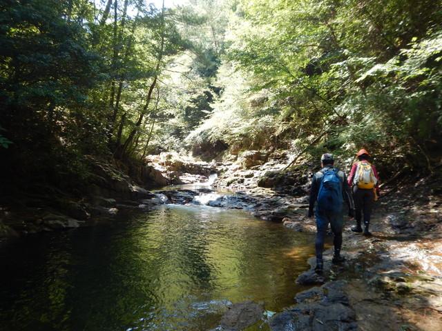 東山橋の脇から沢におりて遡行スタート。前半は穏やかな渓相のなか静かな沢歩きが楽しめます。二つ目の堰堤をこえると沢の水は透明度をまし、市街地の近くにあるとは思えない美しい沢になりました。