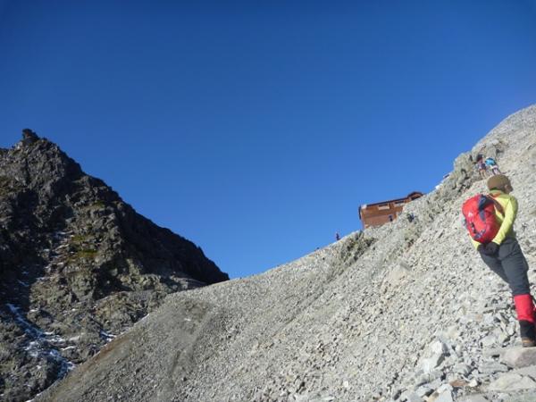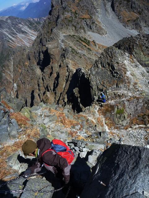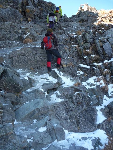- 穂高岳山荘から奥穂高岳へ登るルートは少し雪がついて、凍結していましたが