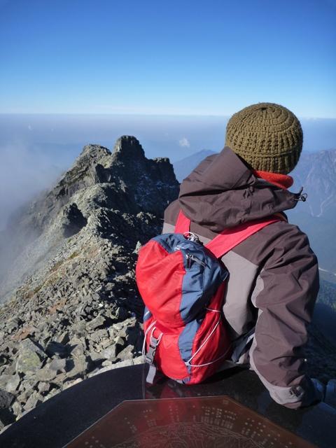 奥穂高岳~北穂高岳の稜線は風が吹くととても寒いので、耳が隠れる