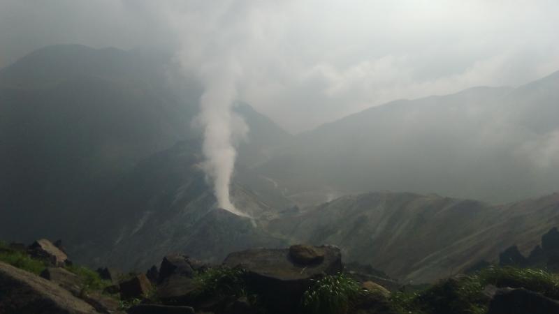 登山開始時の曇天も、星生山頂ではかすかに陽光を浴び、コバエのようなブンブン小虫の洗礼を浴びる。