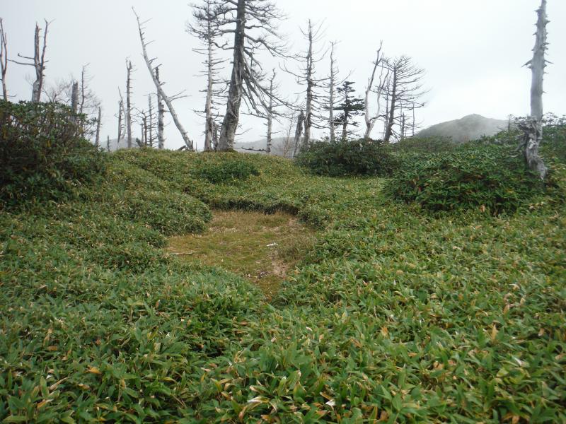・白根隠山~白桧岳 踏み跡はあるが笹で見辛い。倒木に足を引っ掻けないように。