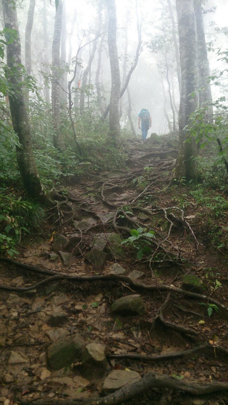 - 雨で濡れた木の根っこはツルツルと滑ります。慎重に足場を選んで歩きました。