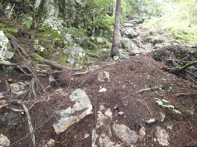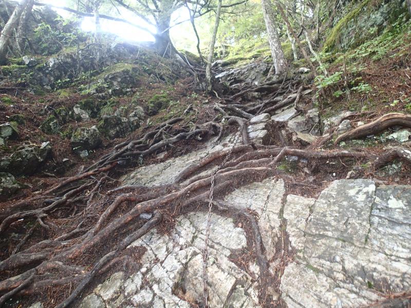 沢から離れ、つづら折りの急登。先日来の雨で土は緩み岩は転がり木の根は滑る、ところもあるので注意。高度を稼げるゴキゲンな登りでもある。ダブルストック有難い。