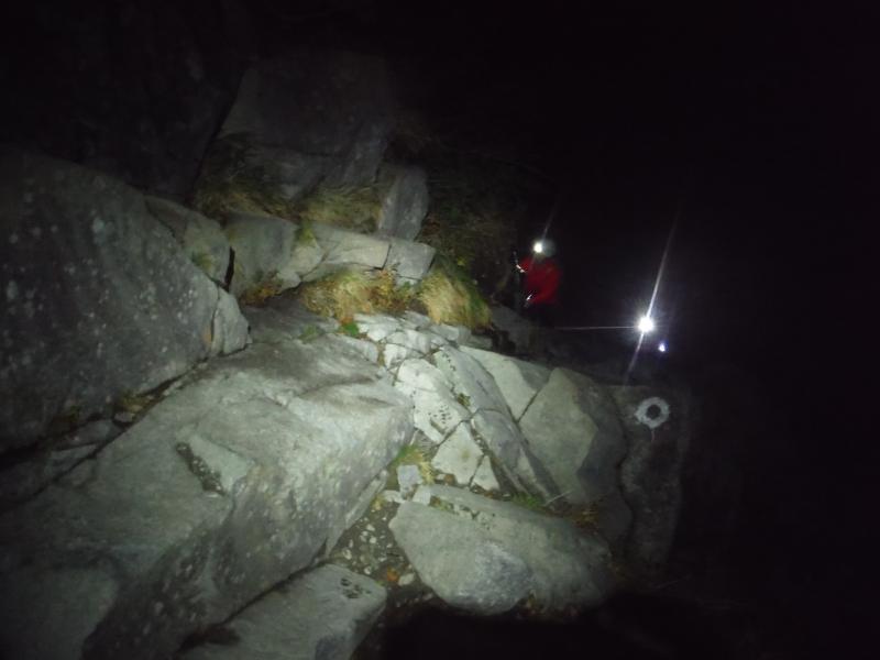 開始早々なかなかの斜面がお出迎え、暗い登山道をヘッドランプで照らして登っていきます。