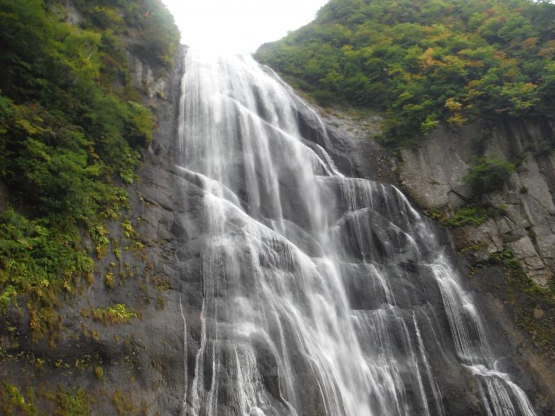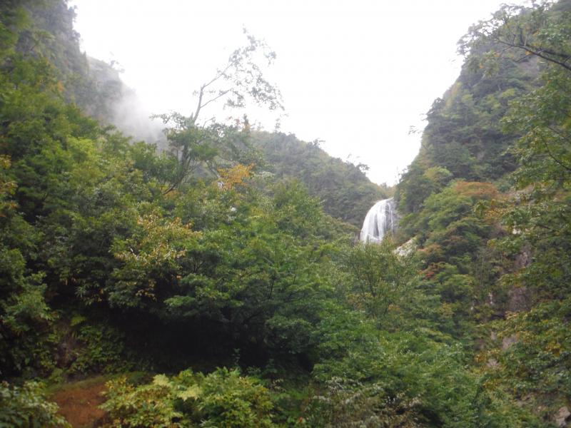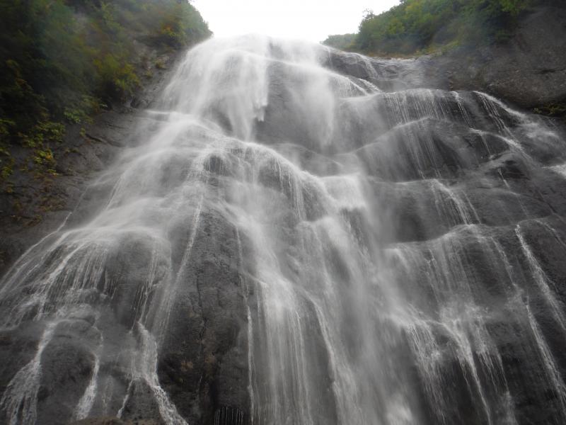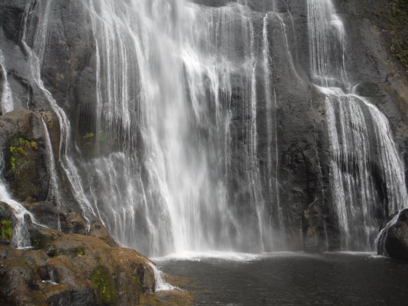 幸い雨は止み、思った以上に歩きやすい道で安心しました。黙々と歩き続けていると突然彼方から滝の轟音が響いてきました。見上げた先には大きな滝が!「プピー!!」(歓声を上げたのですが、笛をくわえていたため声にならず。)早く見たくて急いで滝の展望台までやってきました。そこには巨大な二段の滝が悠然と流れており圧巻の一言。さらに左上に上段への道が続いていたので行ってみることに。なんと上段の滝壺の目の前まで行けるようになっていました。ここまで来ると激しい水しぶきで体が煽られるほど。大量のマイナスイオンを浴びて帰ってきました。