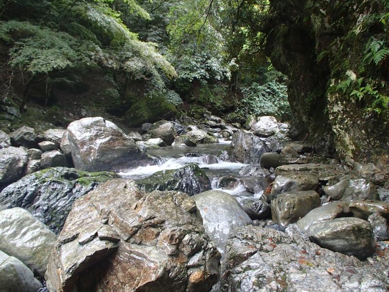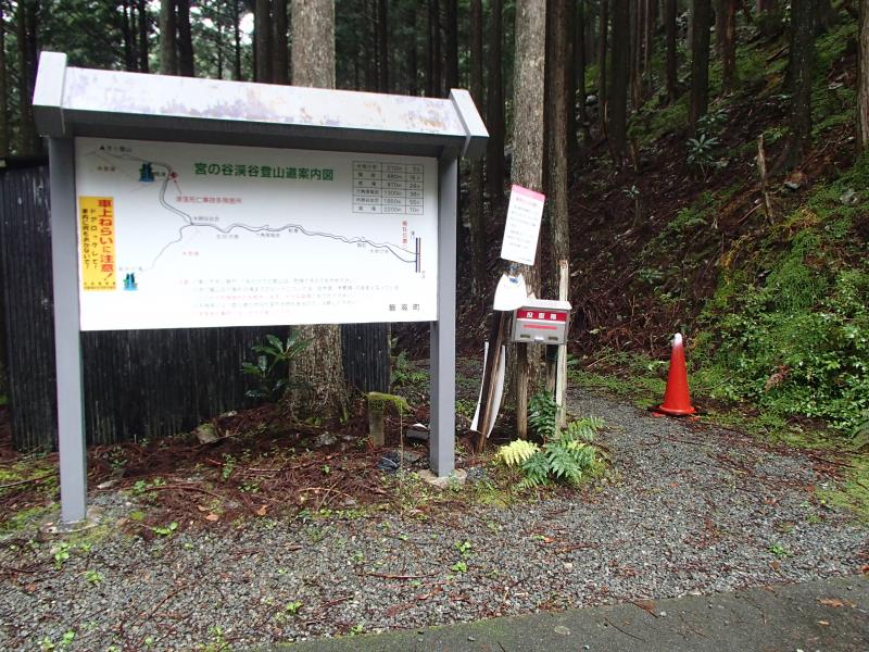 - 宮の谷溪谷登山口>45分>風折の滝分岐>25分>ドッサリ滝>20分>奥の出合>85分>山頂>55分>奥の出合>60分>高滝>65分>宮の谷溪谷登山口