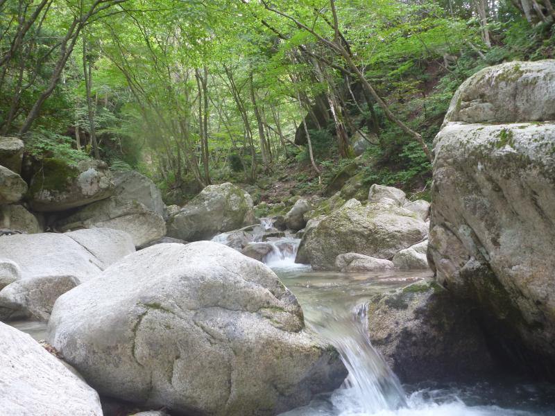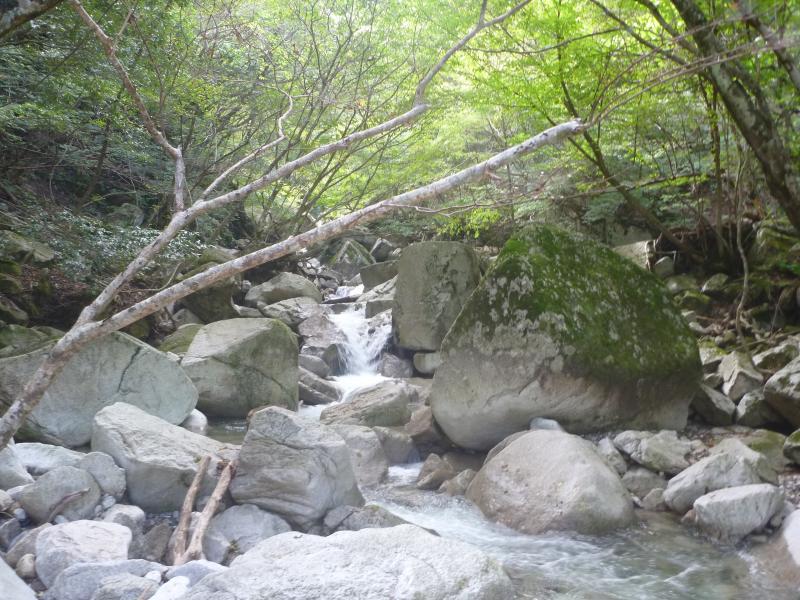 登山道との出合が遡行終了点なので、急斜面の詰めやヤブこぎもなく、すぐに帰路に着けることもこの沢の利点の一つでしょう。