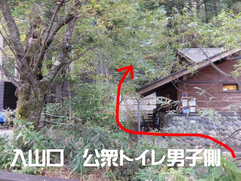 スタートは上高地河童橋の手前にある公衆トイレの裏(男子側)にある擁壁からです。