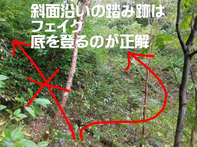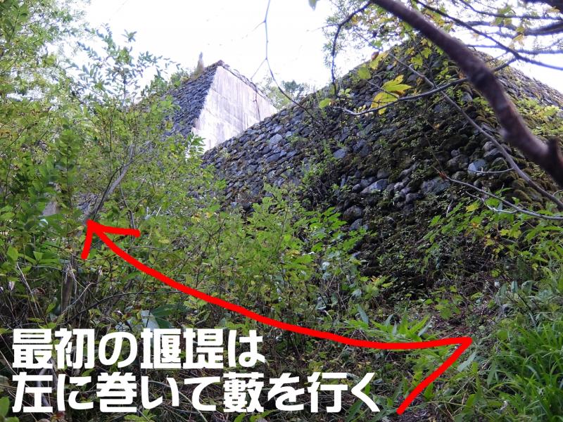 正しくは堰堤を越え、底に降り、踏み跡のない底の藪の中から登って行きます。