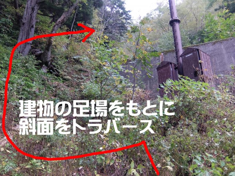 ここは堰堤を無理に越えようとせず、センサー建物の土台を踏み台に、藪の斜面をトラバースするように登って行くと良い感じでした。