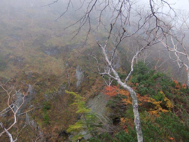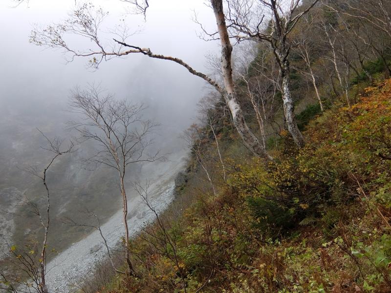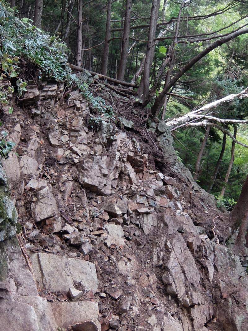 途中崩れやすい崖や広いガレや木の根の張った斜面が続きます。
