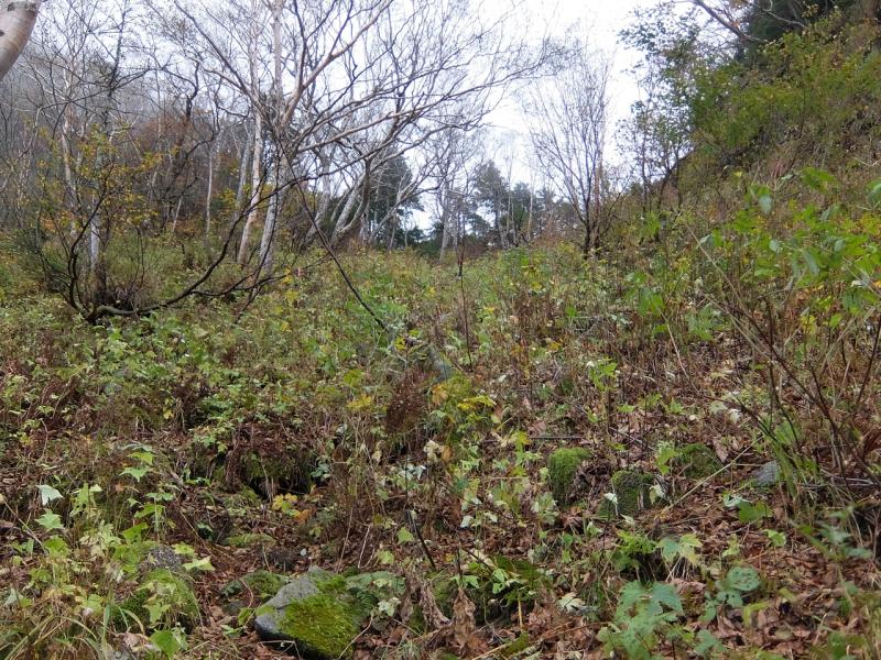 下山は、行きで大きく迂回した北東斜面を行かず、中畠沢から藪の中を沢筋に沿って下山しました。