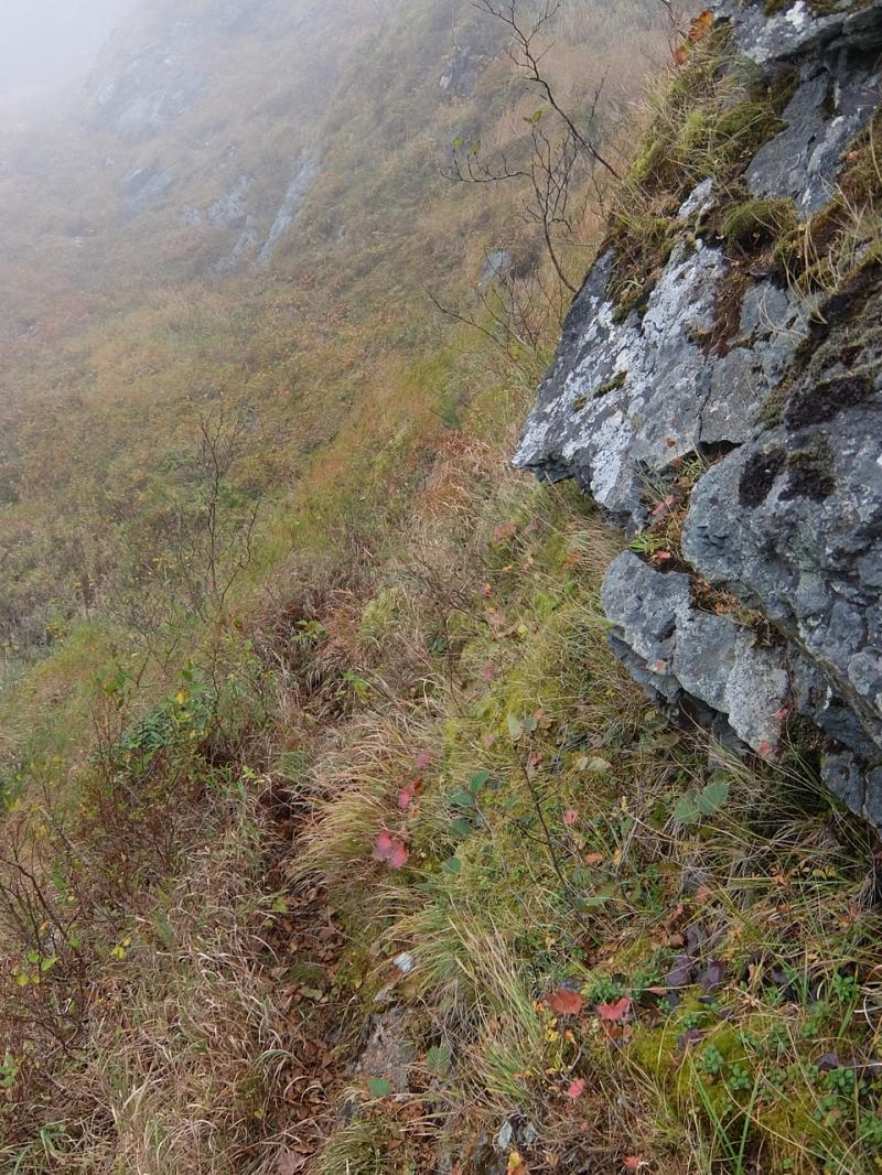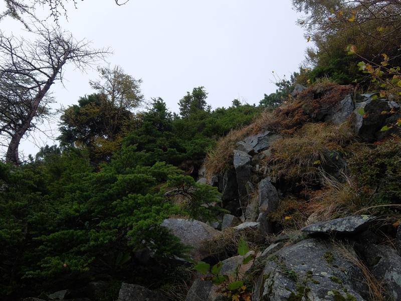 途中でガレと木の根の急斜面や崩れやすい崖を注意して越えていくと、大岩壁へ。簡単には越えられそうにありませんでした。