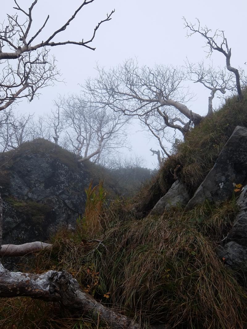 稜線上に出ると、いよいよ横殴りの雨と強風にさらされ、岩場も滑りやすく、風に飛ばされそうに。