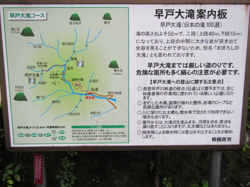 - 魚止橋(15分)伝道(30分)最初の渡渉点(30分)雷平(40分)早戸大滝(30分)雷平(20分)雷滝(20分)雷平(40分)伝道(15分)円山木沢大棚(15分)伝道(15分)魚止橋