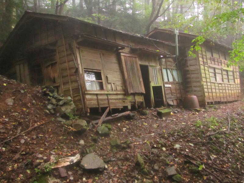 途中古めかしい造林小屋跡の前を通り過ぎますが、まるでお化け屋敷のよう。