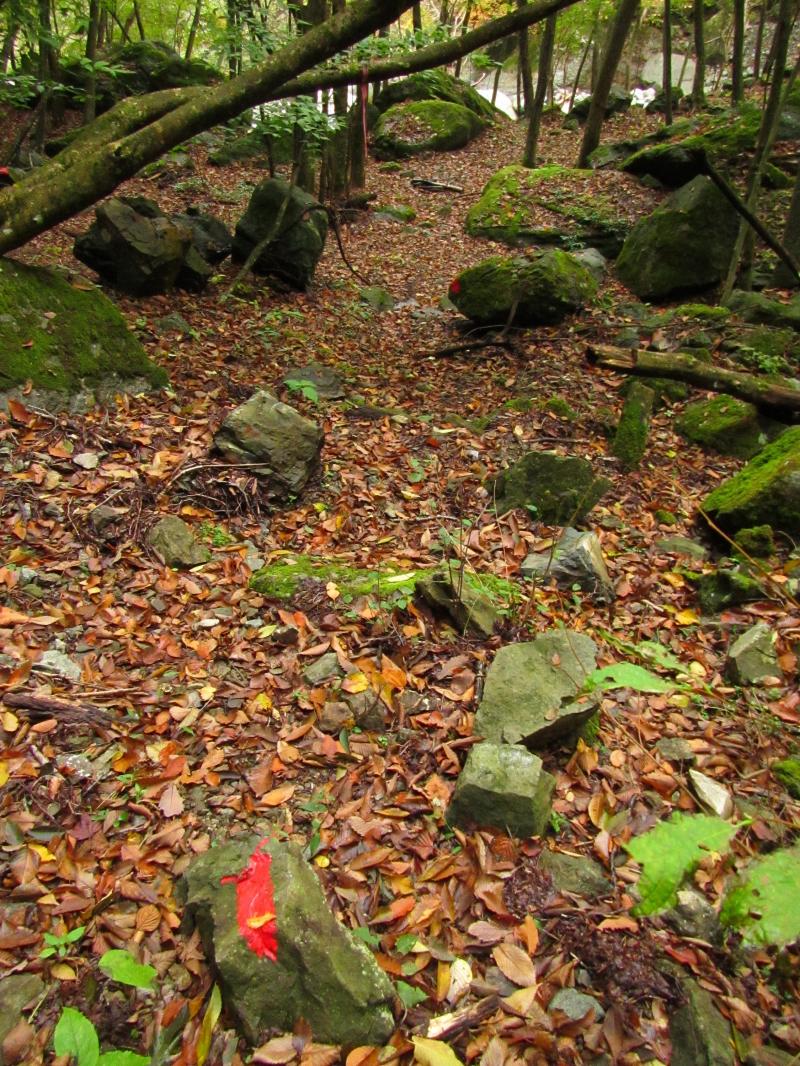 左岸沿いに道らしきものがあり、ごく最近ペンキを塗ったのか、緑の苔が真っ赤になっているところもありました。