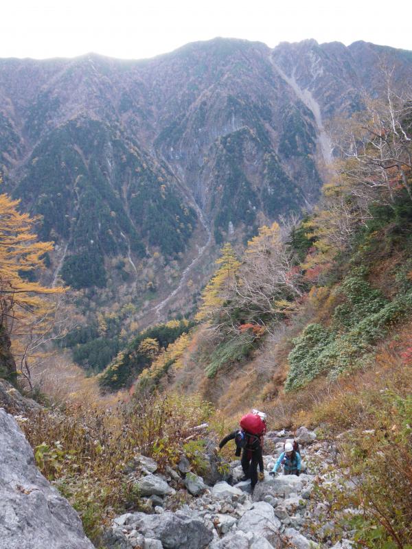 出合より北鎌のコルまでは、急峻なガレ場が続くので気を抜けません。