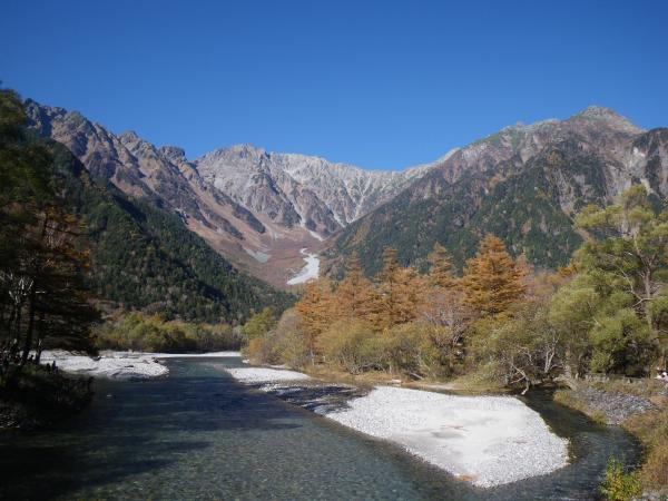 上高地は紅葉のピークのようで、河童橋は沢山の観光客であふれていました。