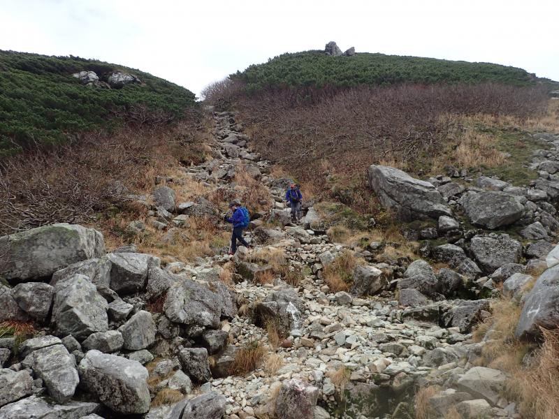 双六小屋から三俣山荘までは行きが巻き道コース、帰りは稜線コースを通りましたが、後者のコースの方が歩きやすい印象を受けました。巻き道と言いながらなかなかアップダウンが多くてこずりました。