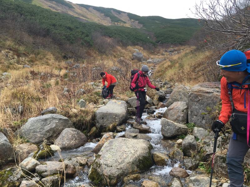 2日目は早朝スタートとなりましたが、終日風があり、レインウェアを着用し、手袋の欠かせない1日となりました。三俣山荘に戻ってきた頃には雪がチラつき、小屋の方に聞いたところ初雪とのことでした。朝方はハイドレーションも凍結する気温と風でしたので、10月の北アルプスは防寒対策が重要なことを再認識させられました。