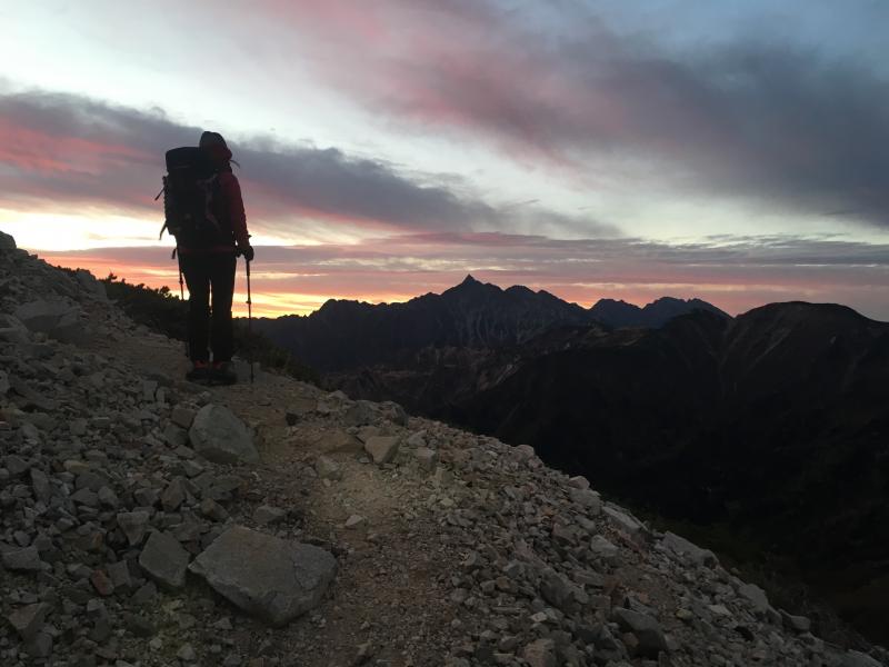 直に明るくなり、朝焼けの槍ヶ岳を望みつつ稜線を歩いていきます。