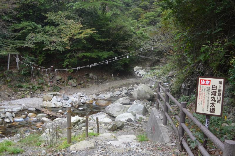 宇賀渓から舗装路を少し歩き、丸太橋を渡り、細い橋を渡ると魚止滝です。