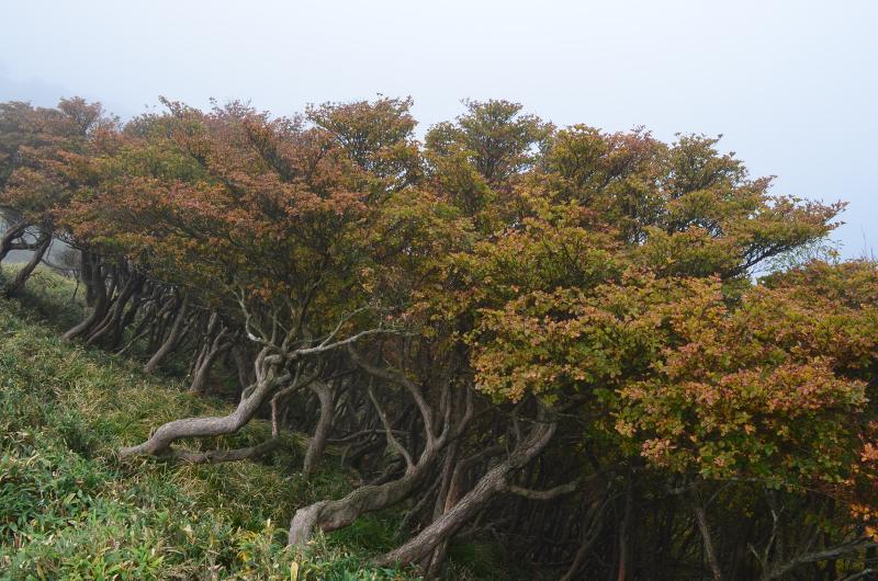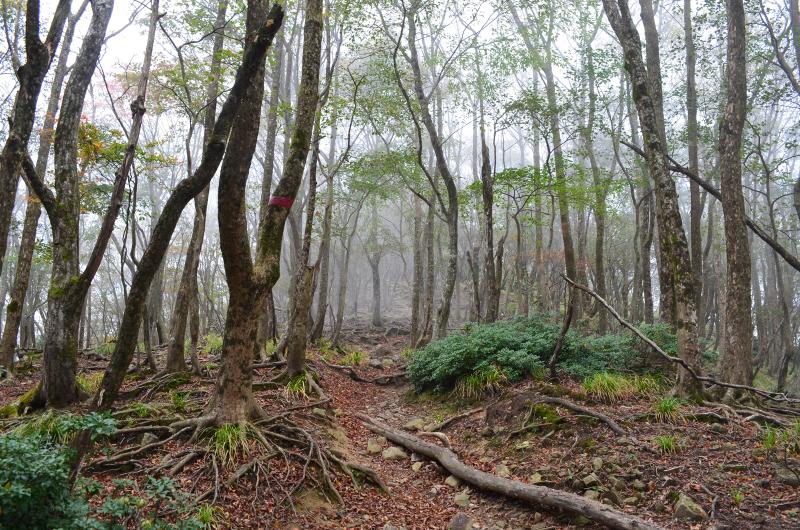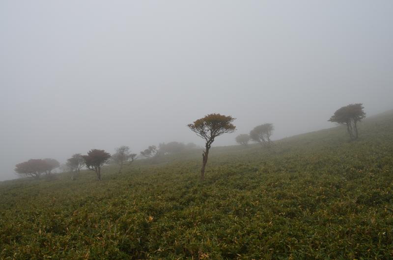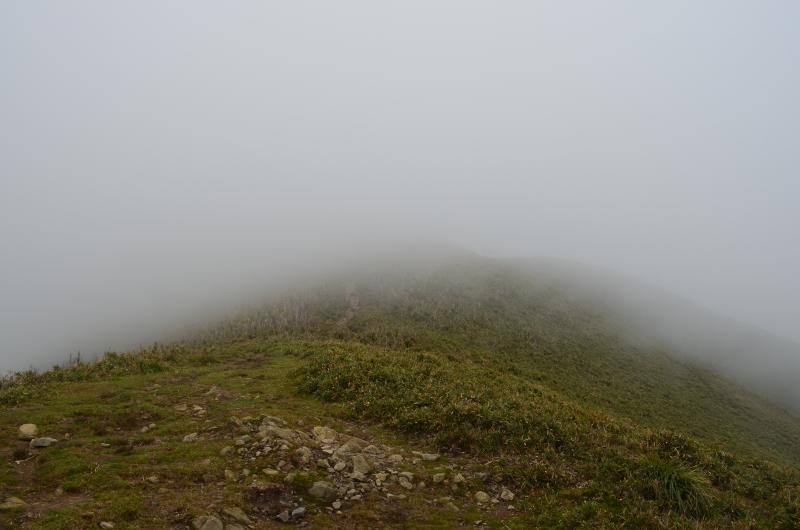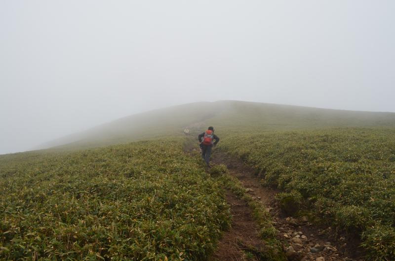 登り切ると、熊笹の広がる緩やかな斜面に出ますが…、残念ながらガスで何も見えず。