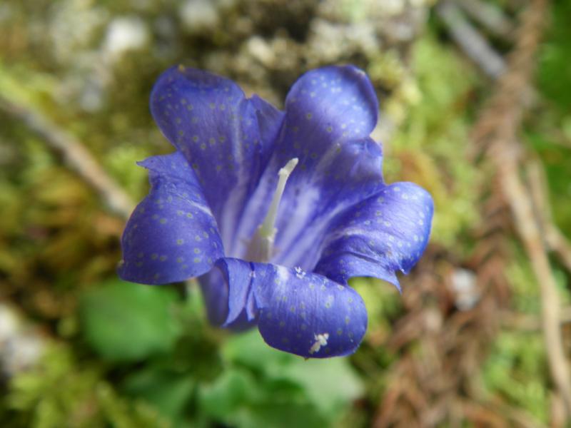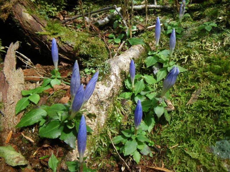 この林道川原木屋線から登ると、林道部分が多く、最短距離で登頂ができますが、あまり人が入っていないのか、木の枝が登山道を覆い、やや歩きにくい感じです。上部はやややせ尾根になっていて、岩混じりでその岩場にはアサマリンドウがちらほら咲いています。