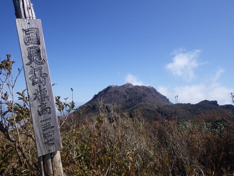 分岐にもどり普賢岳へ。これでもか、、、ってぐらい一旦下ります。段差が大きく足場が悪い場所もあるので気を付けて。鬼人谷口への下りは右に妙見岳、左に国見岳、正面に普賢岳の山肌を見ながら。赤く染まりつつある山肌にようやく今年の紅葉を感じました。下りきると紅葉茶屋。茶屋はありませんが休憩におススメのベンチが。紅葉茶屋というだけあって紅葉が綺麗な場所だと思うのですが今日はまだイマイチな感じ。ここで一服して普賢岳へ。ここからは岩の多い急な登りが続きますがそれほど危険な場所ではないのでしっかり足場を安定させて登ってください。普賢神社を右に曲がればもうそこは山頂!!目の前に平成新山が煙を出してどーーーんとそびえます。あの時は何も見えなかった、、、今日は360度の大展望です。ようやく見ることができました。嬉しい!