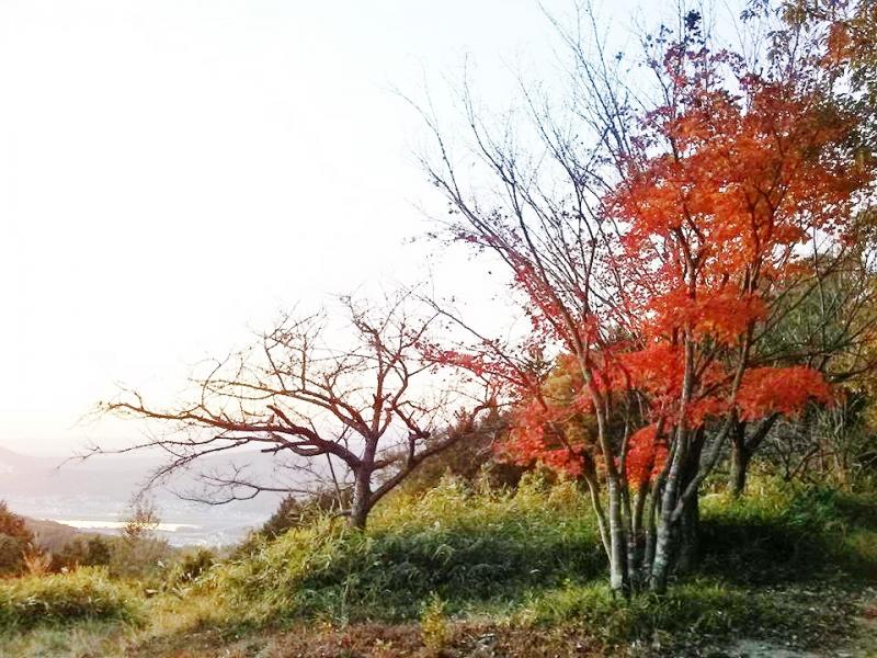 そろそろ紅葉がいいと思い、ジャスト神社のカエデと山頂のカエデが真っ赤でした。