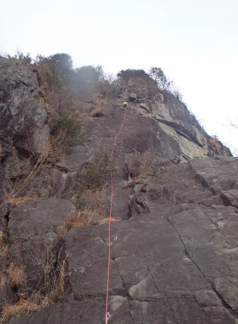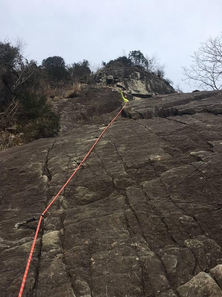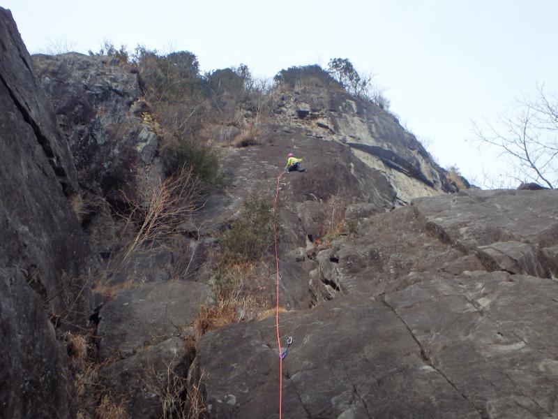 一番下の無名ルートの適当な場所に、トップロープを張って頂き岩の感触を確かめます。