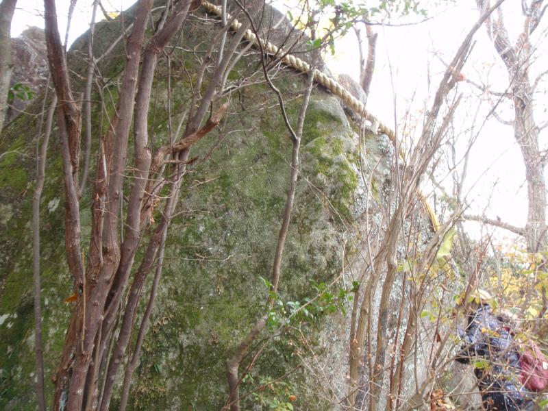 山頂の御神体は大岩ですが、石垣で囲ってあります(珍)、手前にも桃太郎の桃のようにパカッと割れた岩も御神体の様です(女岩)