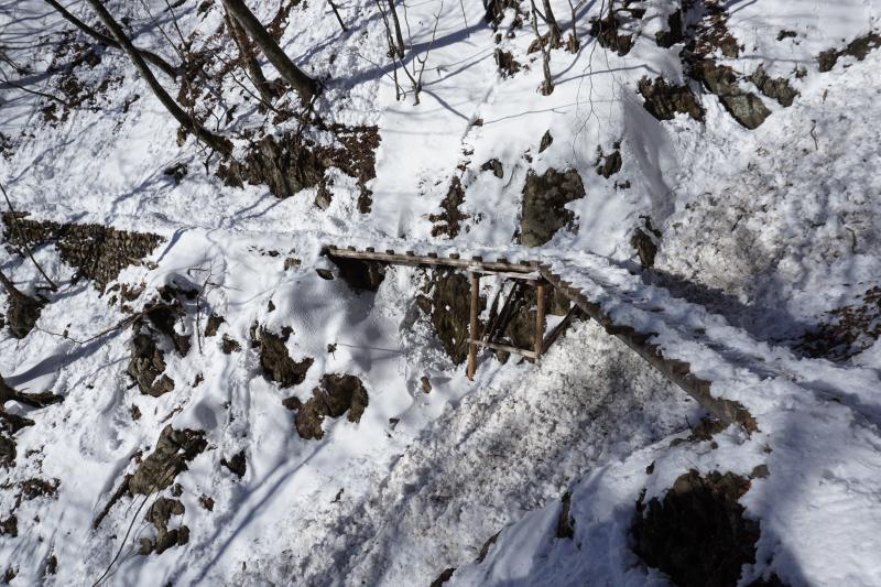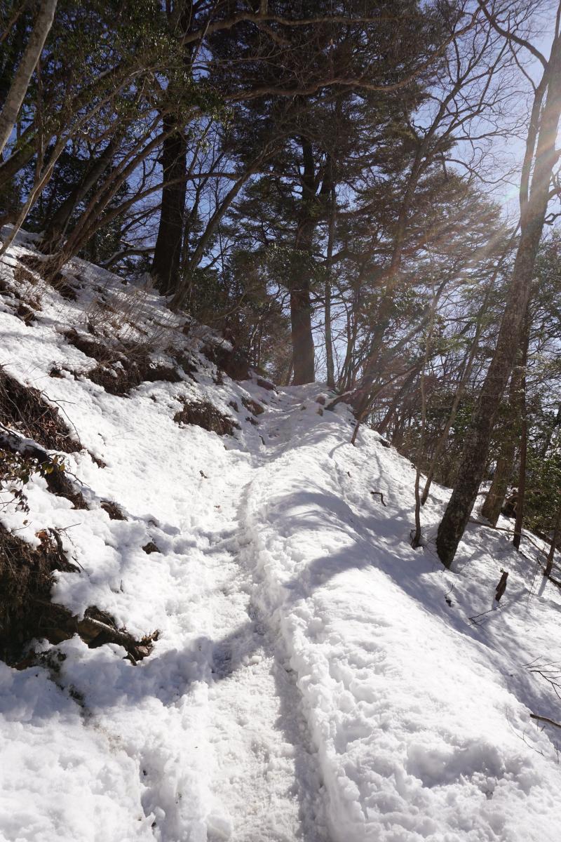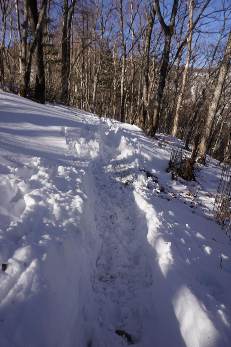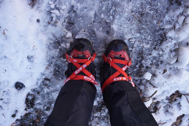 最初はあまり積雪はありませんが、アイスバーンのような箇所があるので早々に軽アイゼンを装着。