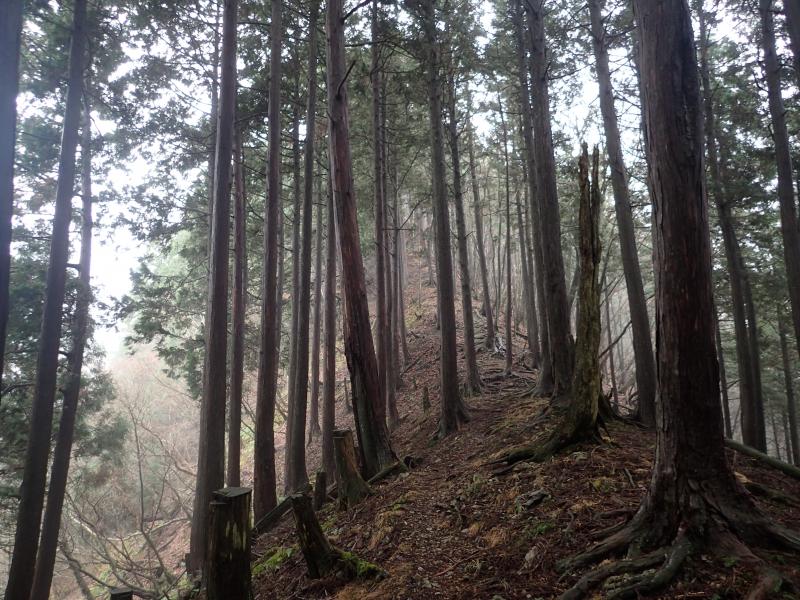 樹林帯なので高度感は少ないのですが、けっこうな崖で左右が切れています。滑落すると大変です。