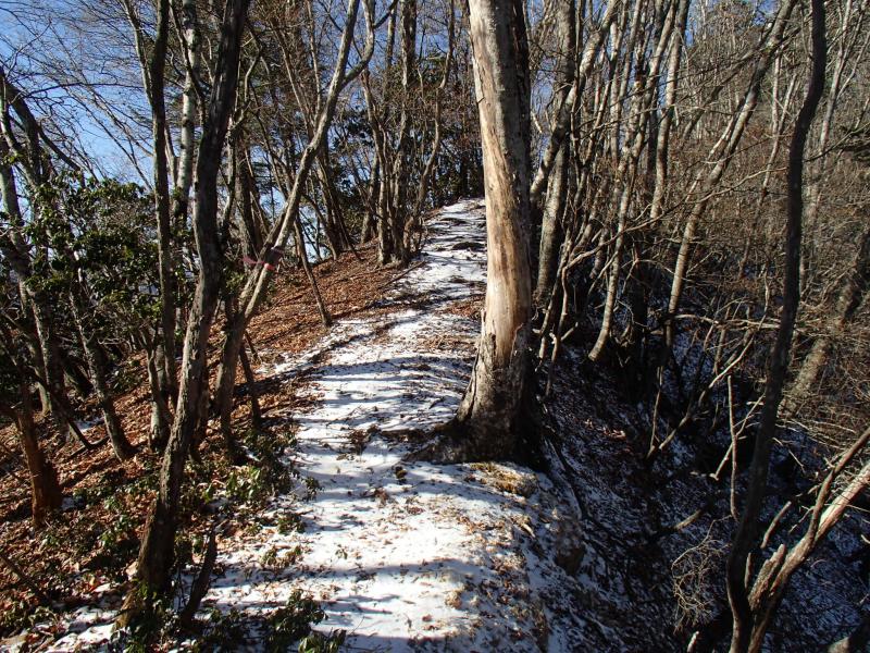 赤岩峠から左右に分かれる県境の道は、右の赤岩岳方面が北側のため日陰で非常に寒く、この時期雪が残るため滑りやすくなっています。