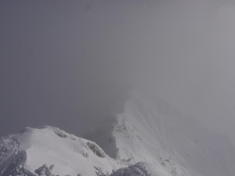 六合目~八合目:さらに積雪は増えますが樹木はまだ雪の上に先端を覗かせています。