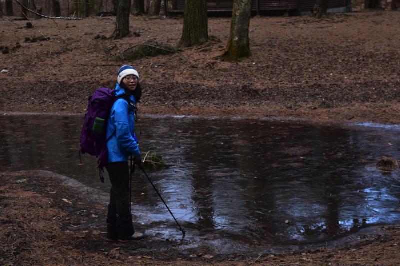 体が温まるまではダウンジャケットと防水のジャケットも着込んでいましたが、だんだん温まったので東屋まではメリノウールの長袖Tシャツとフリースで登りました。