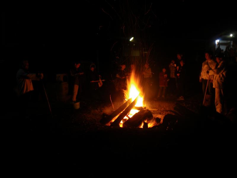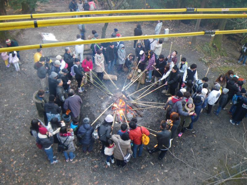 ⑦尾張戸神社では焚き火にあたりながら棒に付け、焼き餅を食べている人もいます