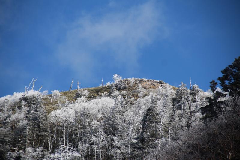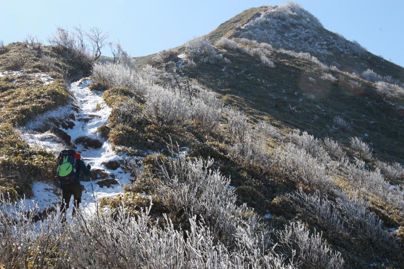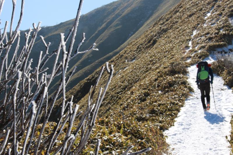 次郎笈のぼりで霧氷ができているくらいでした。山頂はマイナス5度。下界はあたたかな一日でしたが、雪山装備で防寒対策必須です。