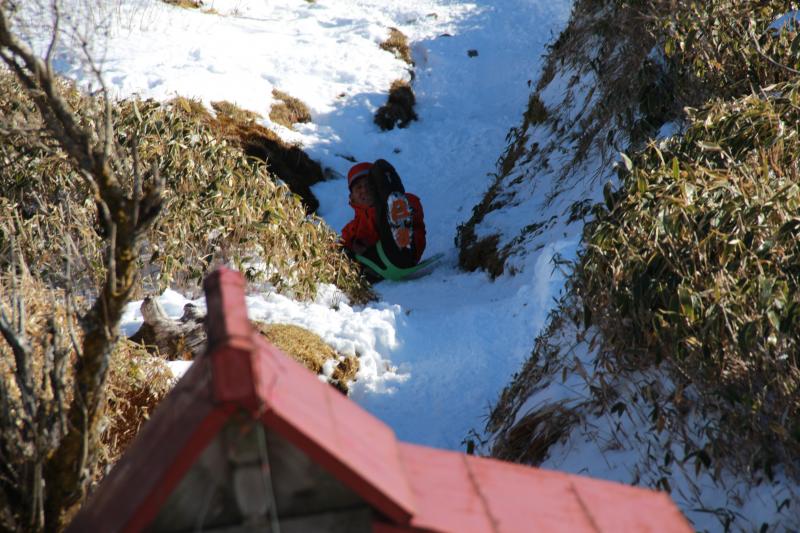 雪は例年より非常に少ないですが、朝は凍っていたため ほとんどの方が10本アイゼンでした。軽アイゼンだと、効かない場合もあり、標高の高い山なので、どちらも持って行って雪の状態できめたほうが今時期はよさそうです。見ノ越神社でアイゼン装着し、剣山の登りでのけて、下り装着、神社ではずしました。どか雪が降ると、夏道はとおらにほうが無難です。