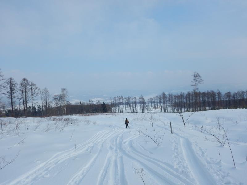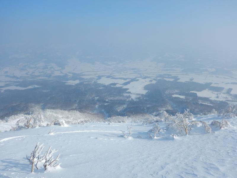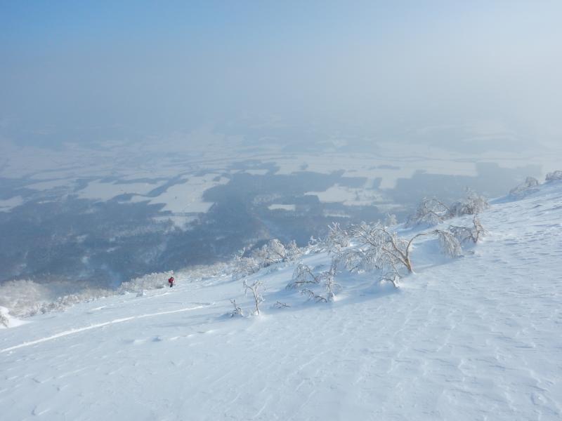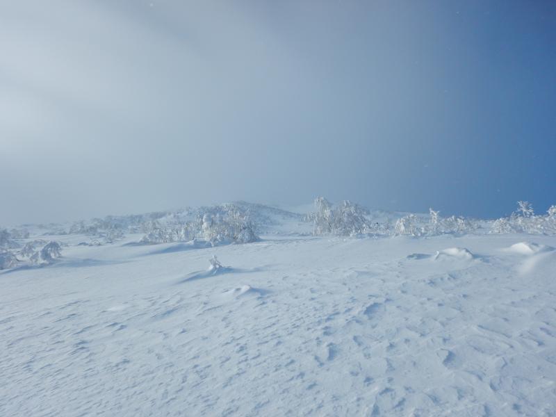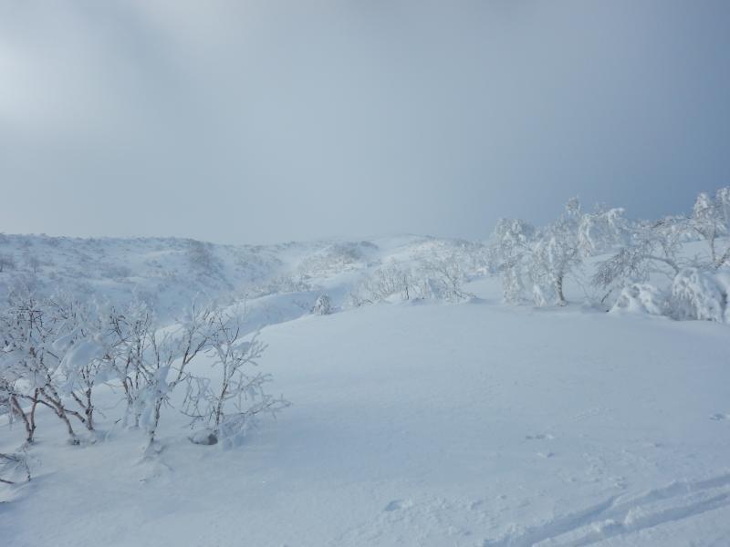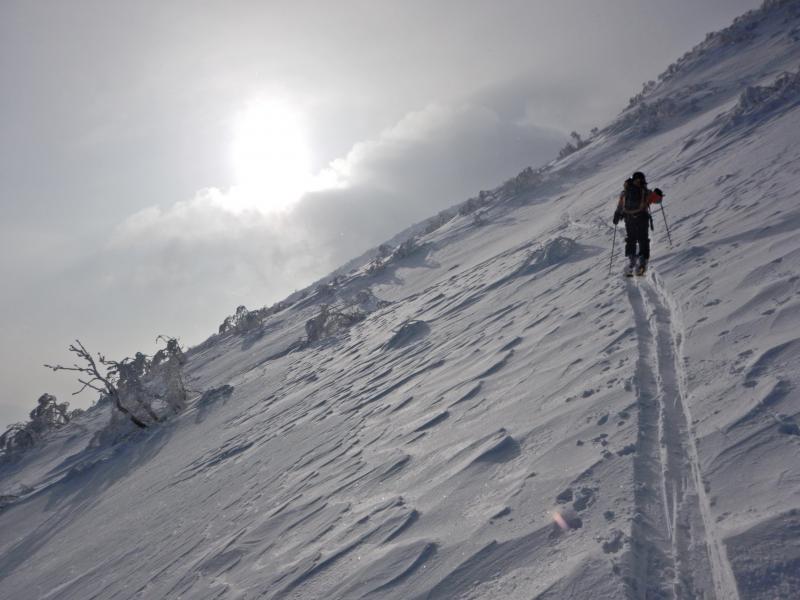 森林限界を超えて1,300mくらいまで標高を上げると雪がしまりだしてきたので