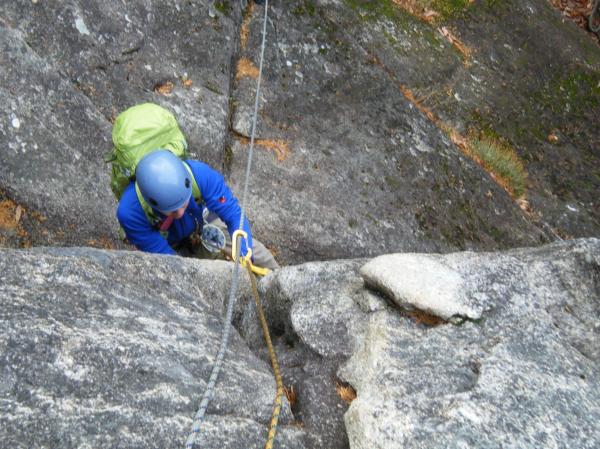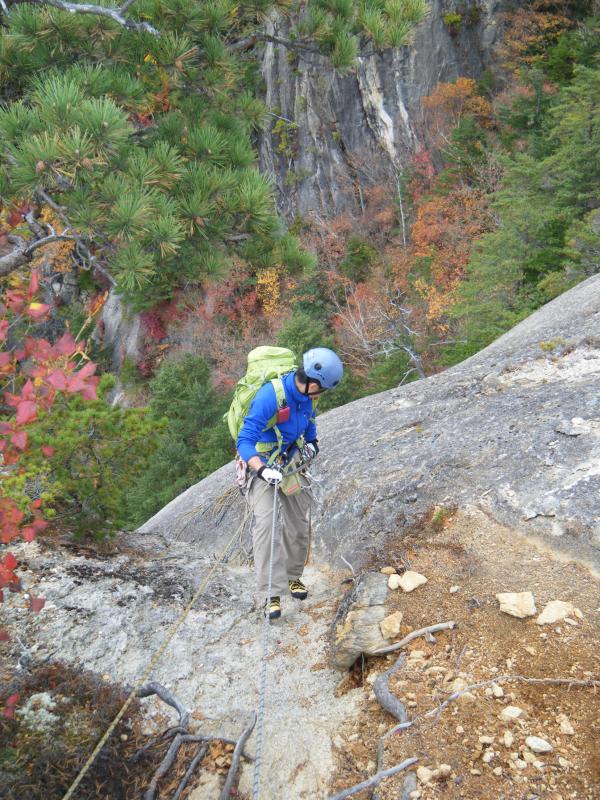 懸垂下降は立木に巻かれた残置スリングを使って、1ピッチで降りられます。