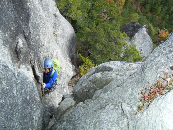 屋根岩2峰のセレクションルートはクラック、スラブ、チムニーとピッチごとに様々なクライミングが楽しめます。