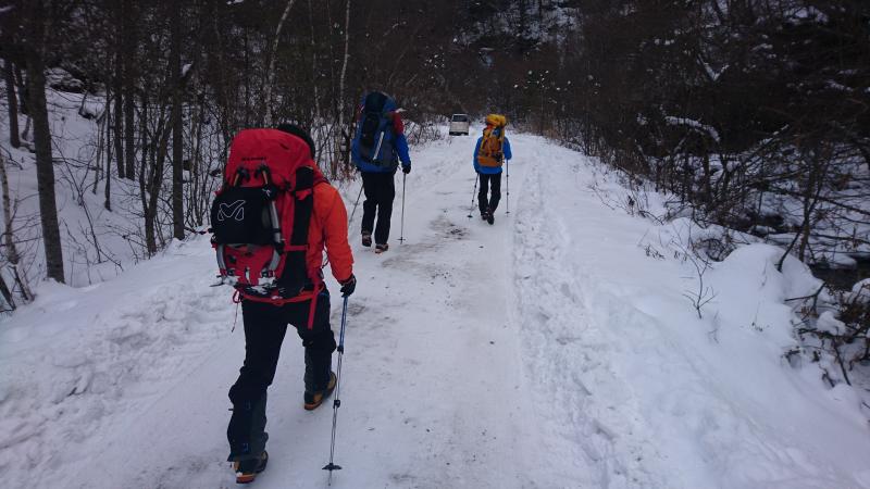 - 美濃戸口~赤岳鉱泉 圧雪の舗装路。チェーンアイゼンがあると便利です。