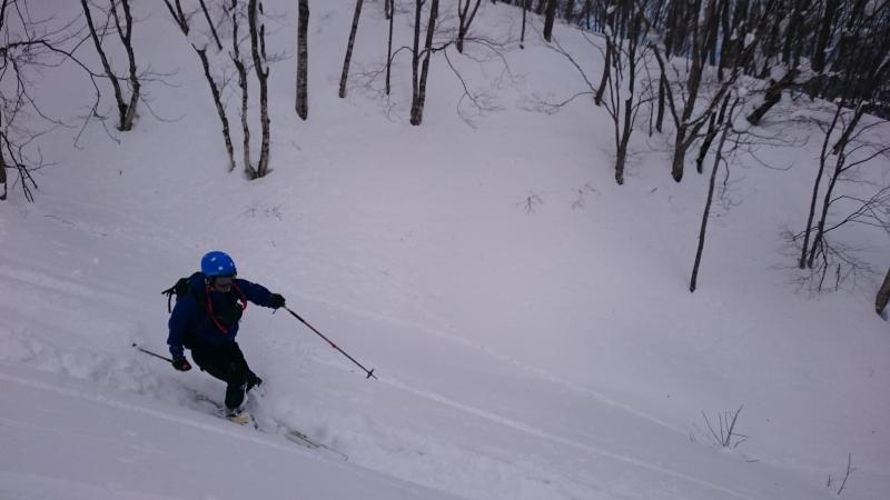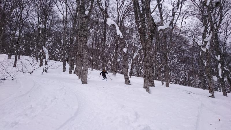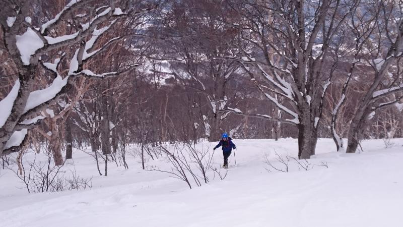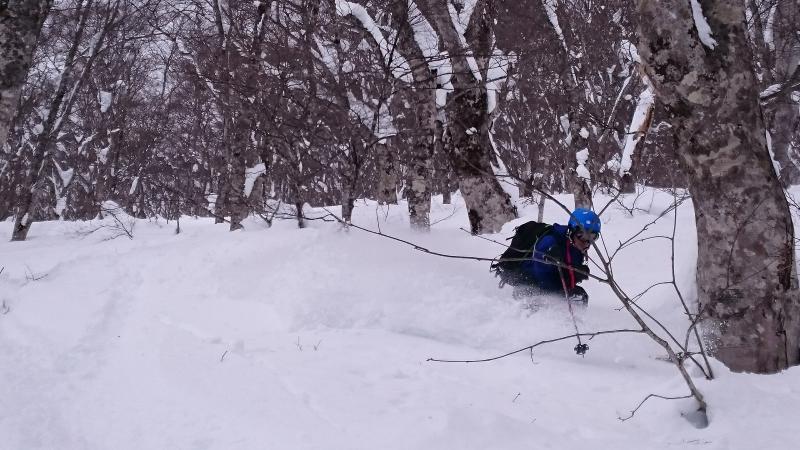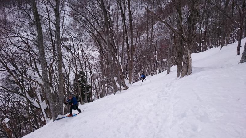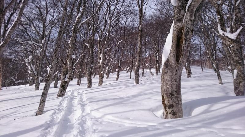 初めは痩せ尾根ですが、すぐに広くなります。以降、ブナの疎林帯で快適なツリーランを楽しめます。