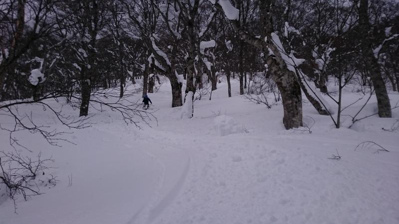 末端まで滑り、沢の渡渉を一回し(場所を間違えないように注意)、アカカンのゲレンデに戻って終了です。