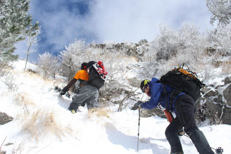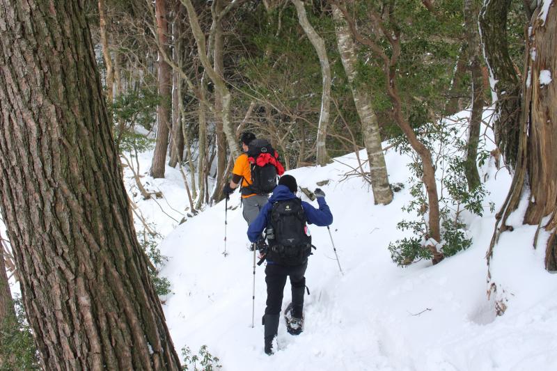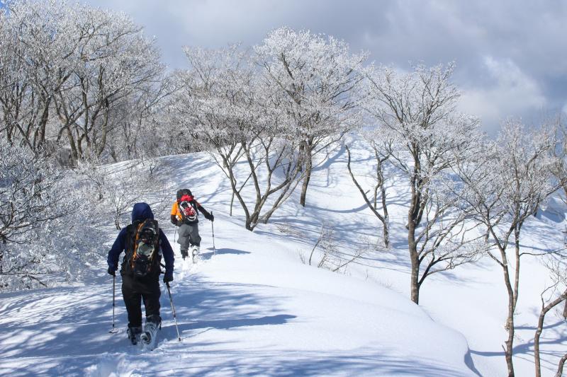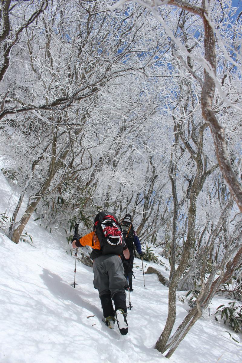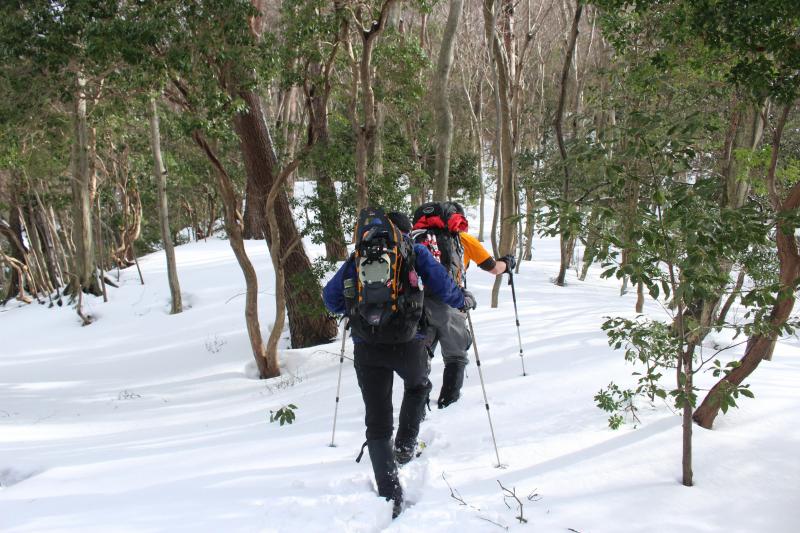 尾根に出るまでは、ワカン、スノーシューを使いました。