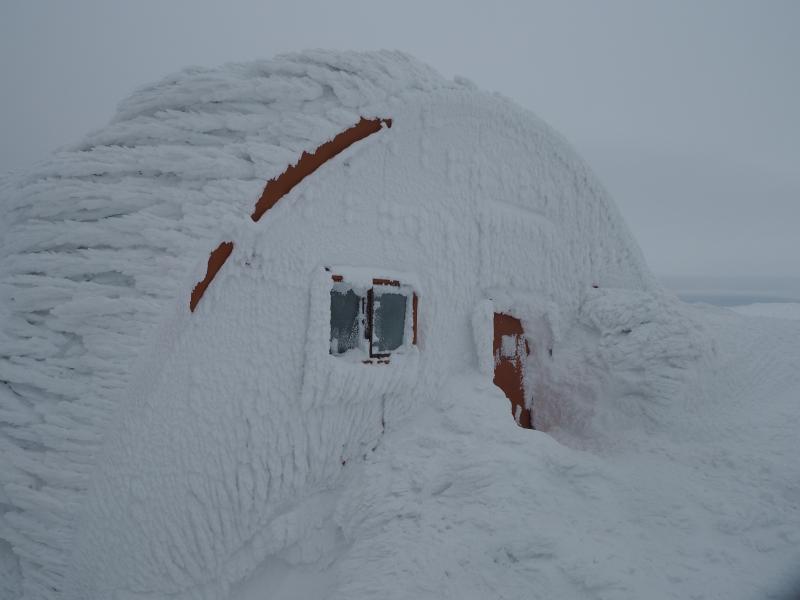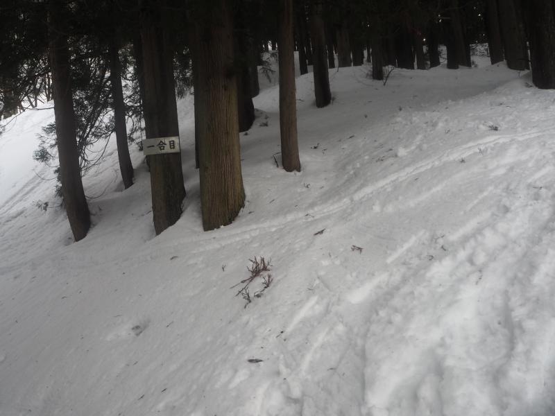 二王子神社まで一時間弱、そういえば初詣がまだだったので今年は二王子神社が最初となりました。お参りを済ませ、三合目までの急登を更に汗だくで登ります。夏でも辛い場所はやはり冬でも辛い。曇りでしたが視界ははっきりしていたので、見落としがちな三合目の避難小屋もしっかり確認できました。トレースを見るとスノーシューとスキーのみ。二王子はスキーヤーも多いのでワカンよりスノーシュー率が高いようです。私の前を歩いていたボードの方は五合目独標から下っていきました。